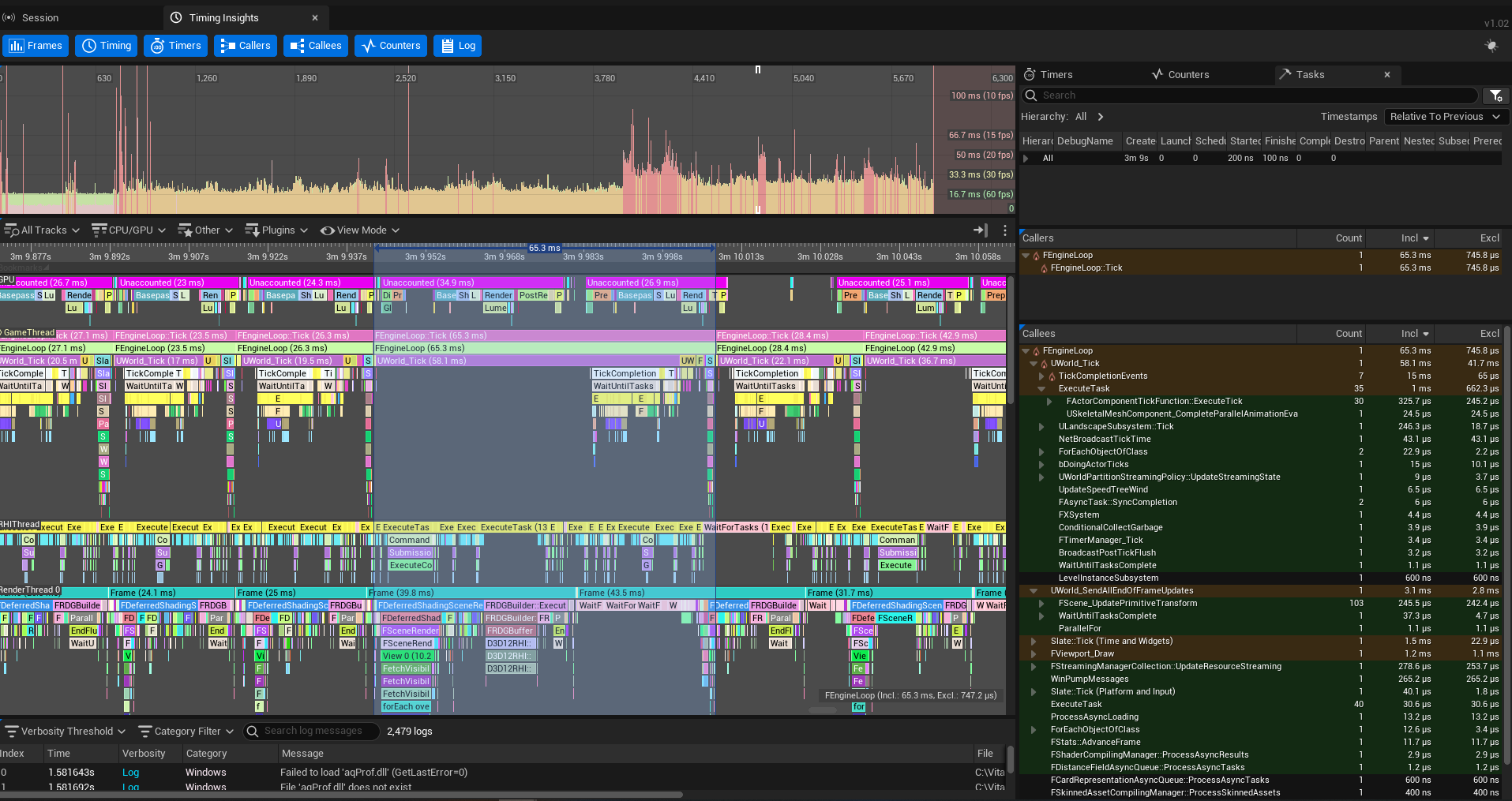 Screenshot of a performance profiling tool with multiple color-coded tracks, timers, counters, and logs related to CPU and GPU activity, showing detailed debug and performance data.